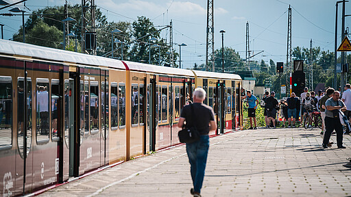 Großer Jubel brandetet auf, als der historische Zug mit charakteristischem Stadtbahner-Sound in den Bahnhof einfuhr.