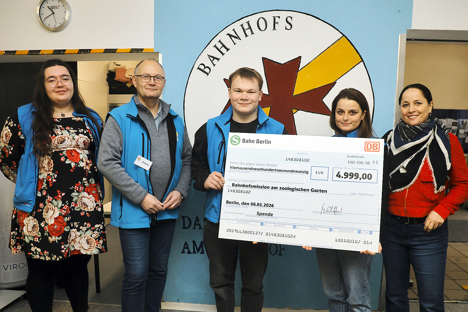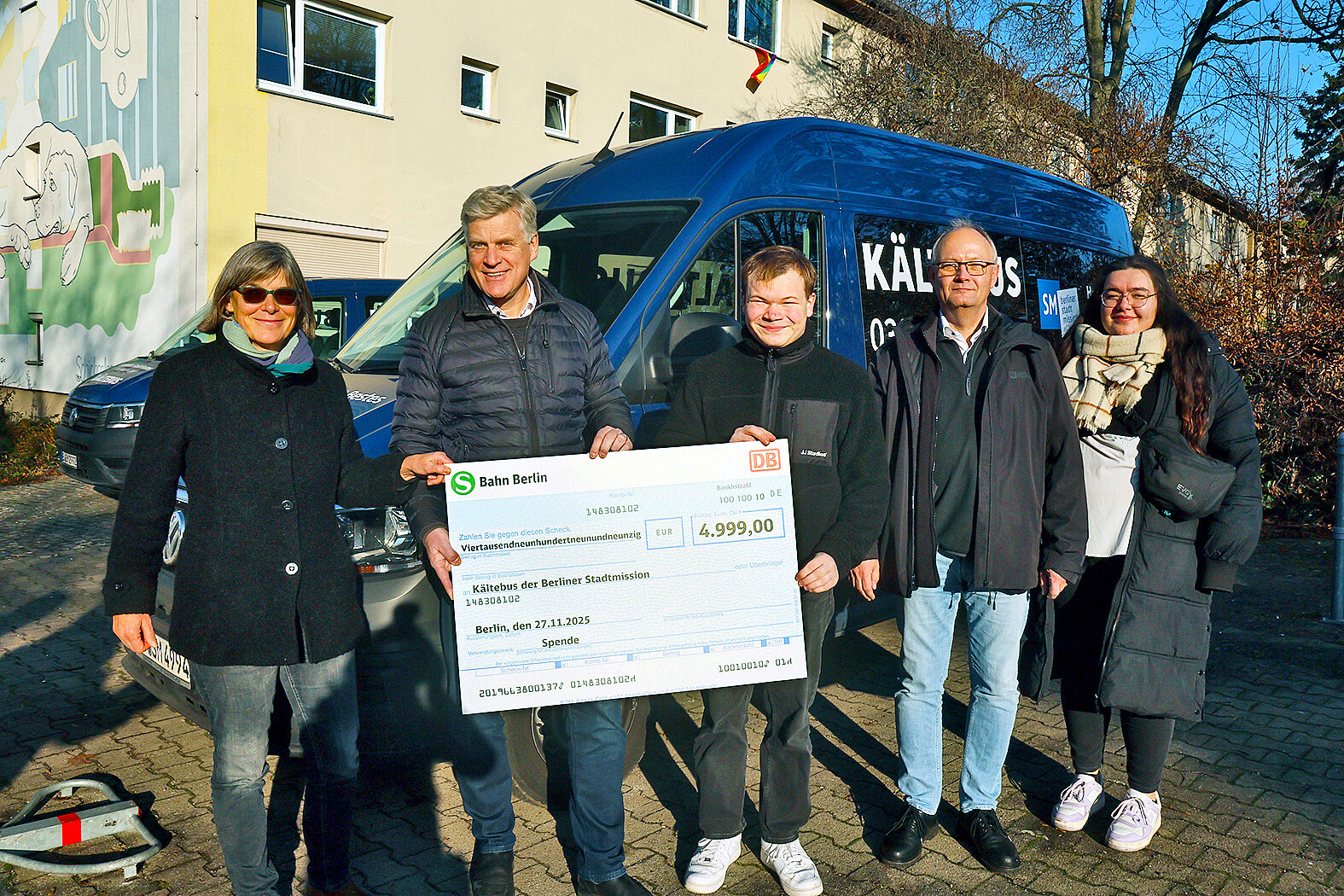 Es ist kalt auf Berlins Straßen und Plätzen, und die Nächte sind lang. Vor allem für Obdachlose ist der Winter eine schwierige Zeit. Damit der Kältebus aber auch weiterhin obdachlosen Menschen Hilfe anbieten kann, haben S-Bahner:innen und S-Bahn-Azubis am 27. November einen Scheck in Höhe von 4.999 Euro an die Berliner Stadtmission übergeben.