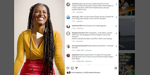 Gleiches gilt für die Kommentare unter den Videos. Auch hier sind alle, die der S-Bahn Berlin auf Instagram folgen, aufgerufen, sich an der Diskussion zu beteiligen. Aber bitte denkt auch bei hitzigeren Themen immer daran, einen kühlen Kopf zu bewahren und auf unsere Netiquette zu achten!