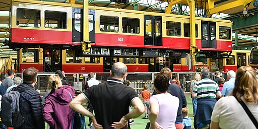 Doch nicht nur künftige Lokführer:innen hatten im Bewerbungszug die Gelegenheit, sich über eine Karriere bei der S-Bahn Berlin zu informieren. Auch Kundenbetreuer:innen sowie Instandhalter:innen wurden gesucht. Interessenten für einen Job in der Instandhaltung konnten direkt mit dem Sonderzug in das Werk Schöneweide fahren und gemeinsam mit Torsten Rudloff einen Blick in das Werk werfen.
