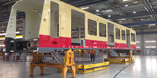 Im Oktober 2017 war der erste rot-gelb lackierte Wagenkasten der künftigen Fahrzeuggeneration in Berlin eingetroffen. Seitdem läuft die Montage auf Hochtouren.