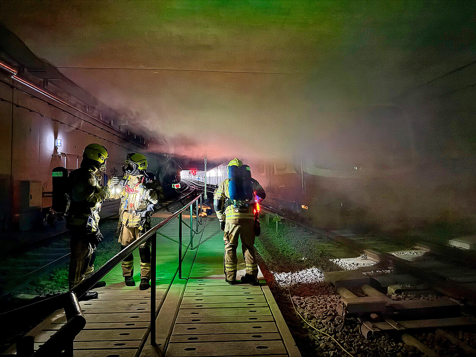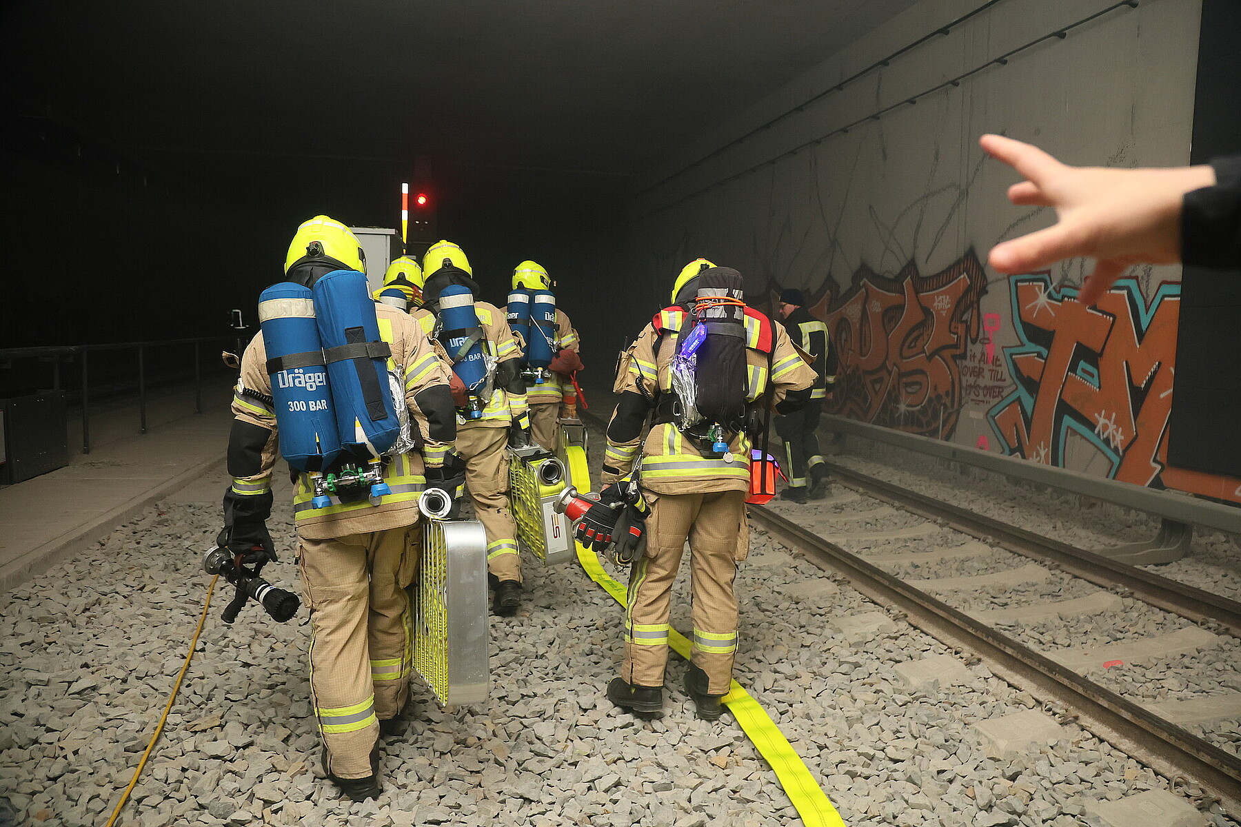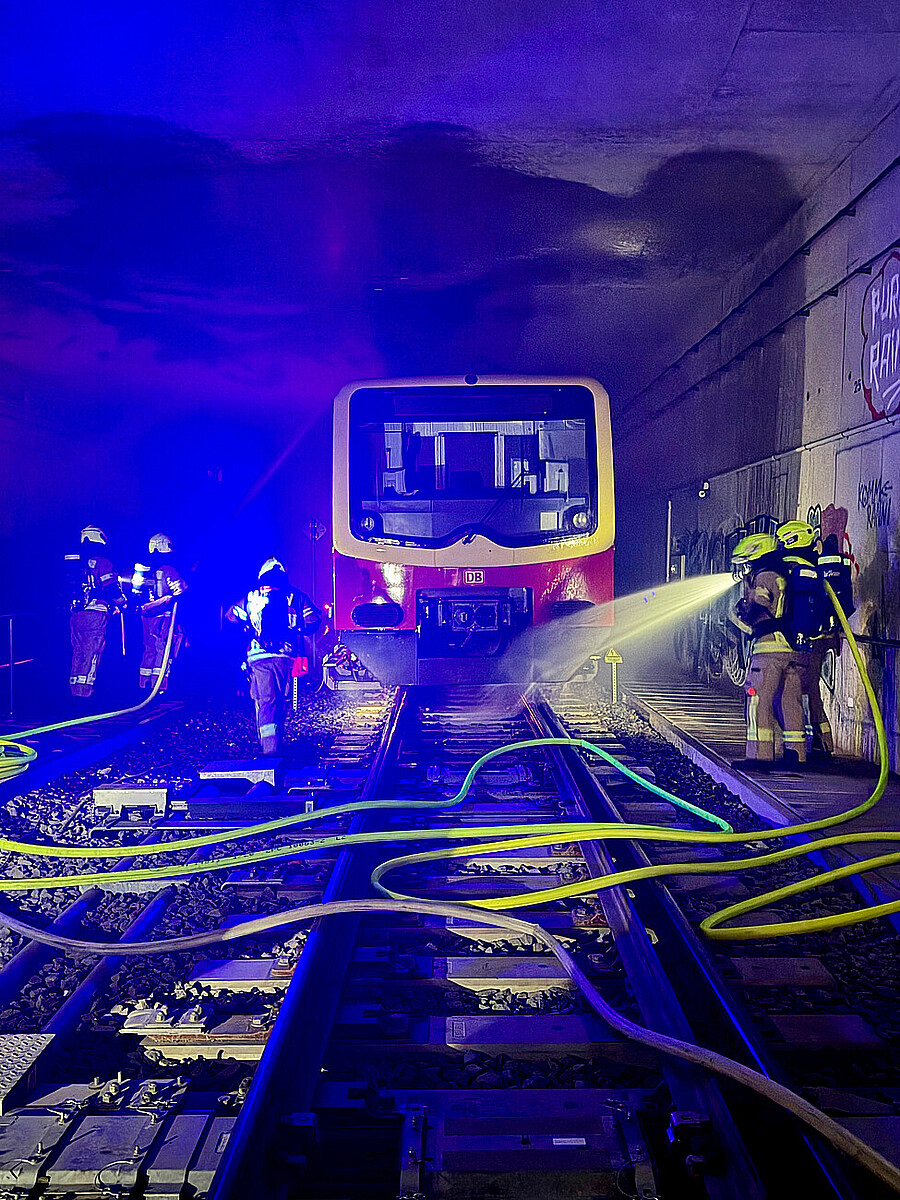 Die Sicht ist schlecht, dichter Rauch wabert durch den Tunnel. An einer S-Bahn ist ein Feuer ausgebrochen. Doch schon nach wenigen Minuten ist die Feuerwehr vor Ort. Schnell verschaffen sich die Feuerwehrleute einen Überblick der Lage und rollen schon bald die gelben Schläuche aus, um die Decke und die Wände des Tunnels herunterzukühlen und das Feuer zu löschen. Doch das Feuer ist nicht echt, und der Rauch kommt von einer Nebelmaschine. Es handelt sich lediglich um eine Übung.