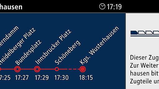Integriert in den oberen Teil des Fensters wird den Fahrgästen künftig der aktuelle Linienverlauf als Perlschnur angezeigt. Hinzu kommen die Ankunftszeiten an den jeweiligen Stationen in Echtzeit. Neu ist auch, dass die iLS, die integrierte Leitstelle der S-Bahn Berlin, Ansagen im Zug tätigen kann – direkter und schneller können fahrgastrelevante Infos nicht zum Endkunden transportiert werden.