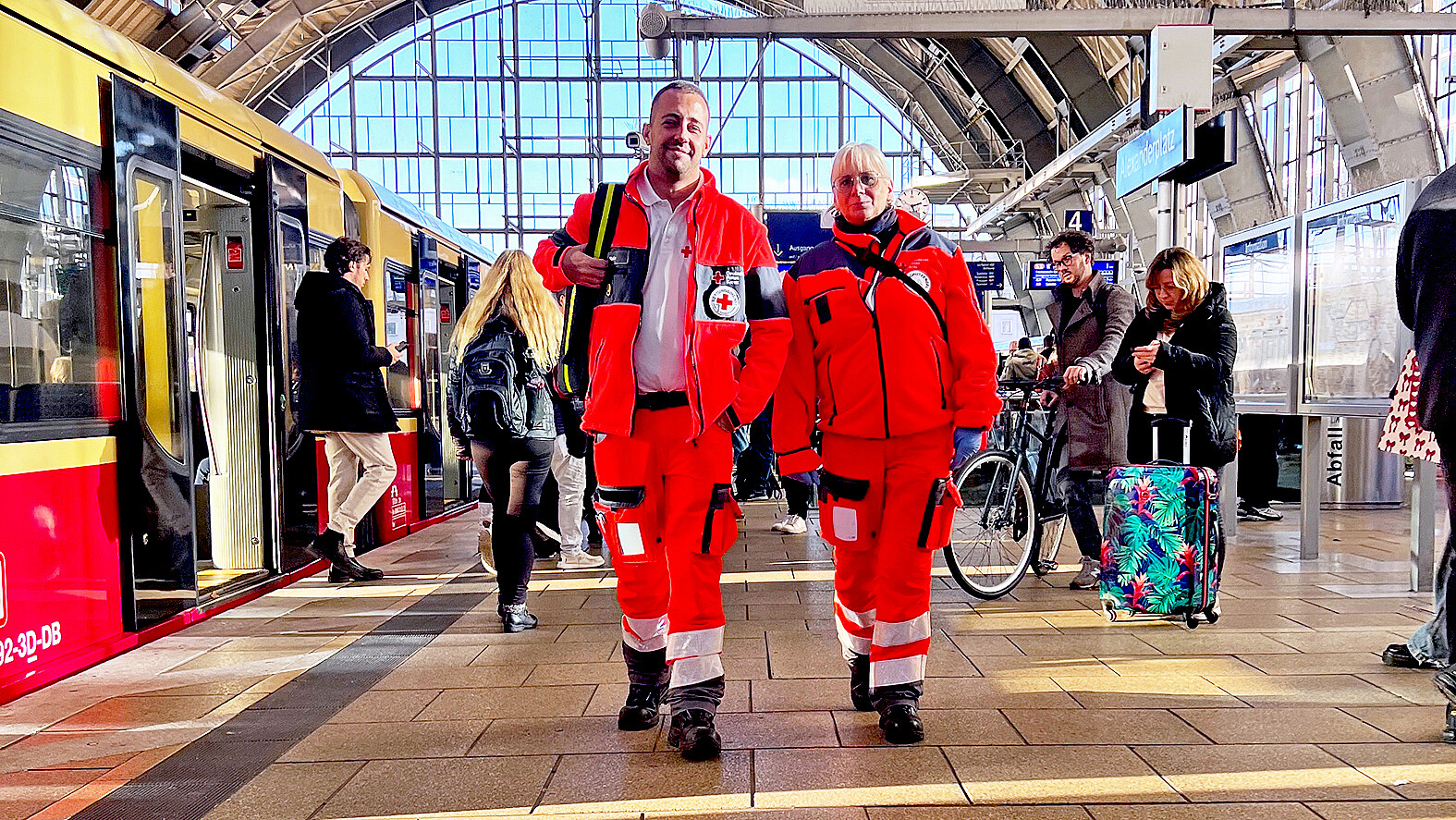 An den Bahnhöfen Alexanderplatz und Hauptbahnhof sind je zwei Sanitäter:innen des Deutschen Roten Kreuzes stationiert, die sich um erkrankte oder verletzte Personen kümmern sollen. Die Helfer:innen sind zunächst montags bis freitags jeweils von 14 bis 17 Uhr vor Ort.