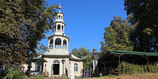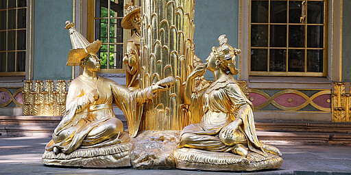Eine breite Rampe führt zum Schloss Sanssouci (1), der königlichen Sommerresidenz, die Friedrich II. einst nach eigenen Skizzen errichten ließ. Lassen Sie Ihren Blick über die Terrassenanlage mit der großen Fontäne schweifen und steigen Sie anschließend die Treppe am linken Rand der Weinreben hinab. Etwa auf halber Höhe zweigt nach links ein Weg ab, über den Sie den Holländischen Garten erreichen. Dort wiederum links befindet sich die Bildergalerie (2), die zu einer Besichtigung einlädt. Der Weg geradeaus durch den Holländischen Garten führt zur Kleinen Fontäne und von dort aus über die Hauptallee rechts zur Großen Fontäne. Hier biegen Sie links und gleich darauf vor der Brücke rechts ab, bis nach etwa 500 Metern entlang eines Wasserlaufs vor Ihnen das Chinesische Haus (3) auftaucht.
