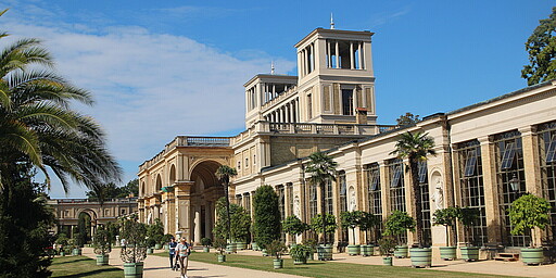 Anschließend treten Sie von der Aussichtsterrasse des Belvederes nach links, entlang des Weinbergs, den Abstieg in den Park an, der am Restaurant und Café Drachenhaus (G) vorbeiführt. Nach einer kleinen Erfrischung in herrschaftlichem Ambiente gelangen Sie über die Treppe wieder zur Maulbeerallee, die Sie überqueren und nach links auf den parallel verlaufenden Fußweg schwenken. Ein Stück weiter quert die Tour erneut die Maulbeerallee und führt über die Treppen hinauf zum imposanten Orangerieschloss (6), auch Neue Orangerie genannt. Wenden Sie sich auf der Terrasse mit Blick auf das Schloss nach rechts und durchqueren Sie, an einer Aussichtsplattform vorbei, den Nordischen Garten. Nach einem kurzen Stück bergab führt Ihr Weg nach rechts durch das Felsentor und bringt Sie zu den Neuen Kammern und der Historischen Mühle. Nach links erreichen Sie entlang der Straße erneut das Schloss Sanssouci. Mit der Sanssouci-Linie geht es zurück zum Potsdamer Hauptbahnhof.