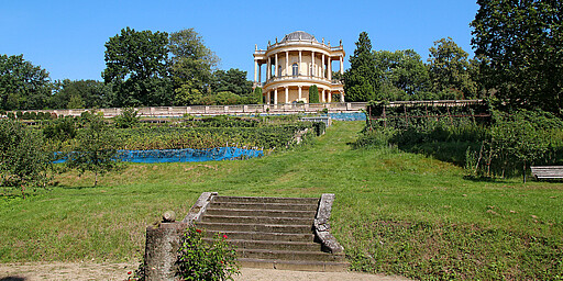 Gehen Sie links um das Chinesische Haus herum und wählen Sie dahinter den zweiten Weg nach links. Anschließend geht es rechts in den Ökonomieweg-Sanssouci, dem Sie durch den Rehgarten zum Neuen Palais (4) folgen, das schon von weitem an seiner hohen Kuppel erkennbar ist. Rechts am Schloss vorbei führt Sie bald die Beschilderung zum Belvedere auf dem Klausberg durch den Hopfengarten genannten Teil des Parks. Sie überqueren die Maulbeerallee und schwenken nach rechts in den Fußweg, der in einigen Kurven zum Belvedere auf dem Klausberg (5) hinaufführt. Von oben offenbart sich ein wunderschöner Blick auf die hügelige und seenreiche Umgebung von Potsdam.