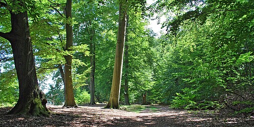 Unter den Kronen von uralten Eichen und wunderschönen Buchen wandeln Sie durch das insgesamt knapp 100 Hektar große Waldgebiet, das von König Friedrich Wilhelm I. als Jagdrevier genutzt wurde. An der Stelle, wo das „Staabe“ genannte Teilstück der Dahme und der Krimnicksee aufeinandertreffen, wartet das „Husareneck“ (5) auf Ihren Besuch. Der Wanderweg folgt nun ein Stück dem Ufer und biegt dann nach rechts in den Wald hinein ab, bis er auf die Chausseestraße stößt. Auf der anderen Straßenseite führt er Sie weiter durch den Wald.