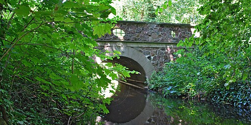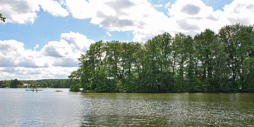 Auf der anderen Flussseite halten Sie sich zweimal rechts und gelangen so zur beschaulichen Uferpromenade, die bis zum Strandbad Neue Mühle am Krimnicksee (2) führt. Hier lassen Sie das Wasser hinter sich, überqueren kurz darauf die Küchenmeisterallee und setzen den Weg schräg gegenüber auf der Krimnickallee fort. An der nächsten Kreuzung nehmen Sie rechts die Birkenallee und erreichen eine kleine Brücke, hinter der links die Parklandschaft Klein Venedig (3) beginnt. Der Weg am Wasser entlang lädt auch zu einer Pause auf einer kleinen Insel mit Sitzgelegenheit ein. Nachdem Sie die beiden Tonteiche umrundet haben, geht es auf dem Uferweg und der Uferpromenade zurück zur Schleuse.