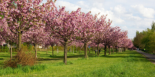 Die Tour startet am S-Bahnhof Lichterfelde Süd, Ausgang Fürstenstraße. Folgen Sie linker Hand dem Holtheimer Weg bis zu seinem Ende (ca. 500 Meter). Hier laufen Sie weiter geradeaus und betreten einen Fußgängerweg, der nach wenigen Metern die Kirschblütenallee (1) entlang des ehemaligen Grenzstreifens kreuzt.