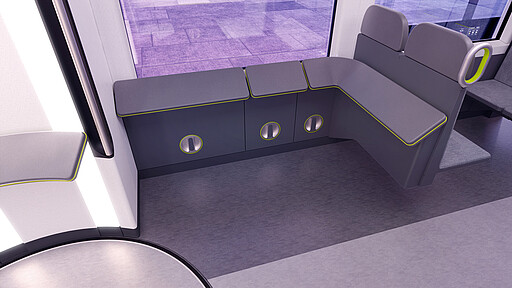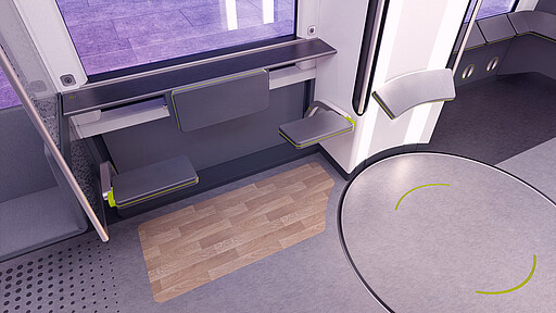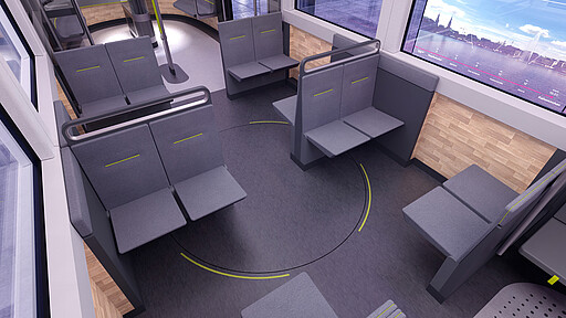 Insgesamt 12 Bereiche lassen sich je nach Tageszeit und Reiseanlass der Fahrgäste automatisiert an ihre Bedürfnisse anpassen. Durch die automatisierte Veränderung von Sitz- und Stehkomponenten werden in Hauptverkehrszeiten ausreichend Kapazitäten für die steigende Zahl an Fahrgästen geschaffen.