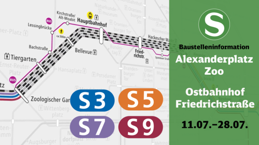 Mit Beginn der Sommerferien starten unterschiedliche Baumaßnahmen im S-Bahnnetz. Über die Sperrung auf der Stadtbahn zwischen Ostbahnhof und Zoologischer Garten wurde bereits vor einem Monat informiert. Neu ist, dass die Bauzeit sich ändert, denn die Sperrung beginnt am 11. Juli anstatt schon am 8. Juli.