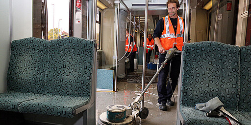 Every S-Bahn train is subjected to a nightly interior cleaning, which means that any trash lying around is removed and floor washings are carried out. In order to keep the vehicles clean during operation, mobile cleaning teams at the end stations are put to work. Every 14 days, an intensive cleaning is carried out in the factory and a thorough cleaning takes place every three months. Every corner, every edge, and every seat is cleaned while the floors are treated and sealed.