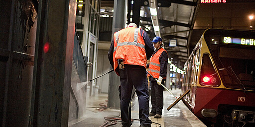 In order for the train stations to make an inviting and well-groomed impression, they are regularly cleaned and adapted to the needs of customers. This means that there is one cleaning per day at the quieter S-Bahn stations, while more frequented stations, such as on the Ring, see cleaning teams in action up to four times a day. The cleaning procedure includes sweeps, trash removal, and up to four times a week, the more frequented stations are power-washed. A cleaner pendles back and forth to ensure cleanliness at stations such as Neukölln, Hermannstraße, Jannowitzbrücke, and Hackescher Markt.