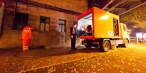 For large-scale graffiti, removal is taken over at night by two mobile teams. Since 2011, these special teams have been using a mobile graffiti power-washer throughout the S-Bahn network. This high-pressure technology and can transport large amounts of water and chemicals that are essential for removing graffiti.