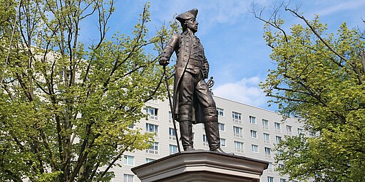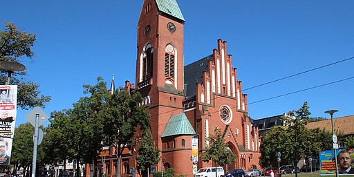Mit der S3 fahren Sie bis zum S-Bahnhof Friedrichshagen und verlassen den Bahnsteig in Richtung Fürstenwalder Damm und Bölschestraße. Nachdem Sie die Treppe hinuntergegangen sind, folgen Sie rechts der kurzen Unterführung und gelangen nach Überqueren des Fürstenwalder Damms auf die Bölschestraße – eine der schönsten Flaniermeilen Berlins mit vielen kleinen Geschäften und Cafés. Spazieren Sie am Marktplatz Friedrichshagen mit dem Bronzestandbild Friedrichs II. (1) und der imposanten Christophorus-Kirche (2) vorbei.