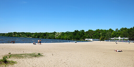 Durch einen Wald führt der Weg jetzt am idyllischen Müggelseeufer entlang, bis der Pfad Sie links zum Fürstenwalder Damm bringt, in den Sie rechts einbiegen. Gleich nach dem Jugenddorf am Müggelsee geht es rechter Hand durch die Drehtür zum Strandbad Müggelsee (6), das kostenlos zugänglich ist.