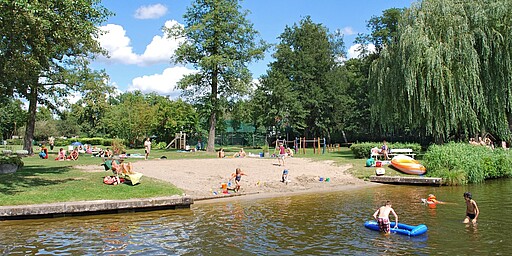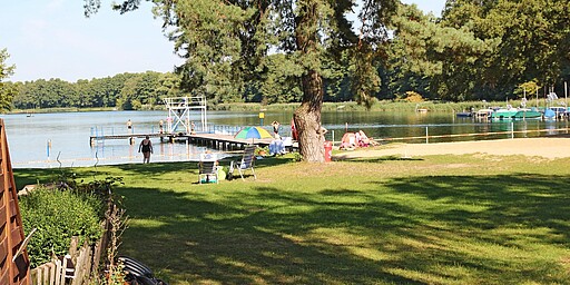 Etwa einen Kilometer entfernt von der Schleuse Neue Mühle liegt das Freibad am Krimnicksee: Eine riesige Liegewiese mit Bäumen, ein Spielplatz mit Klettergerüst, eine Rutsche für Kinder und der kleine Sandstrand bieten Sonnenhungrigen und Badenixen jede Menge Möglichkeiten für Spiel, Spaß, Entspannung und Erfrischung.