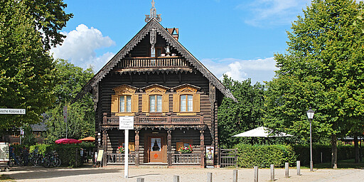 Fahren Sie mit der S 7 bis Potsdam Hauptbahnhof und von dort mit der Tram 92 (Fahrtrichtung: Kirschallee) oder 96 (Fahrtrichtung: Campus Jungfernsee) bis zur Haltestelle Puschkinallee. Hier erblicken Sie auf der linken Straßenseite bereits die Gärten der Siedlung Alexandrowka (1). Überqueren Sie die Straße und besuchen Sie die Kolonie aus 13 Holzhäusern.