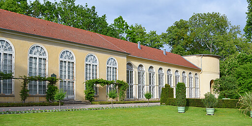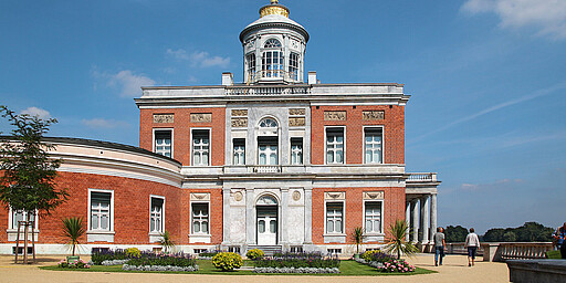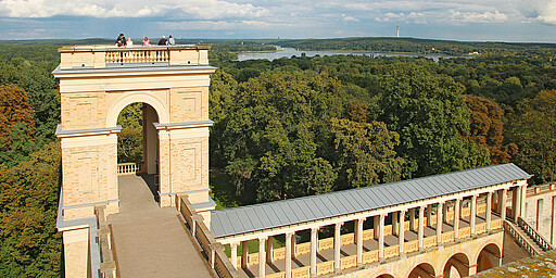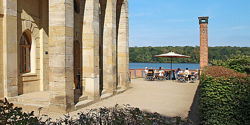 Der anstrengende Aufstieg wird belohnt: mit einem großartigen Rundumblick bis weit ins Havelland und auf die Berliner City! Im Anschluss laufen Sie durch den Laubengang zum Pomonatempel. Folgen Sie dort rechts dem gepflasterten Weg bergab immer geradeaus bis zur gelb verputzten Villa, in der sich das Theodor-Fontane-Archiv (4) befindet. Durch das Mirbachwäldchen gelangen Sie zum Neuen Garten. Hier halten Sie sich zunächst geradeaus, überqueren den asphaltierten Ökonomieweg und wählen direkt dahinter den rechten Abzweig, der Sie an der Pyramide vorbei zum Marmorpalais (5) führt. Umrunden Sie den marmorverzierten Ziegelbau im Uhrzeigersinn und genießen Sie hier den Ausblick über den Heiligen See. Auf der anderen Seite des Marmorpalais angelangt, halten Sie sich am Obelisken links und am nächsten Abzweig gleich wieder rechts. So erreichen Sie die Orangerie (6), deren Seitenportal im ägyptischen Stil gestaltet ist. Zurück am Marmorpalais folgen Sie den Wegweisern zum Schloss Cecilienhof (7). Links am Schloss vorbei führt Ihr Weg Sie an der Borkenküche entlang zur Meierei, in der sich heute eine beliebte Gasthausbrauerei (G) befindet.