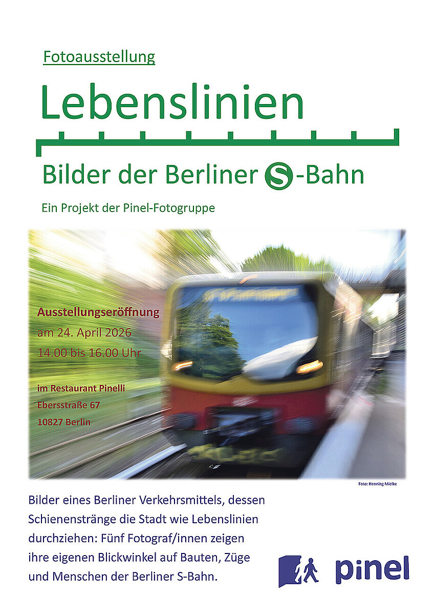 Die Pinel-Fotogruppe hat sich ein ganz besonderes Thema vorgenommen, das nun in einer Ausstellung präsentiert wird: Bilder eines Berliner Verkehrsmittels, dessen Schienenstränge die Stadt wie Lebenslinien durchziehen: Fünf Fotograf:innen zeigen ihre eigenen Blickwinkel auf Bauten, Züge und Menschen der Berliner S-Bahn.
