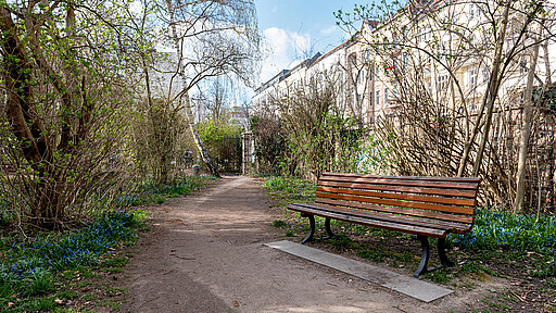 Auf verschlungenen Wegen zwischen Friedhofsbäumen und Rosenbüschen trifft man hier immer wieder auf ausgefallene Klettermöglichkeiten für Kinder und Erwachsene. Bänke, eine sonnige Wiese und sogar Hängematten laden zum entspannten Lesen ein.